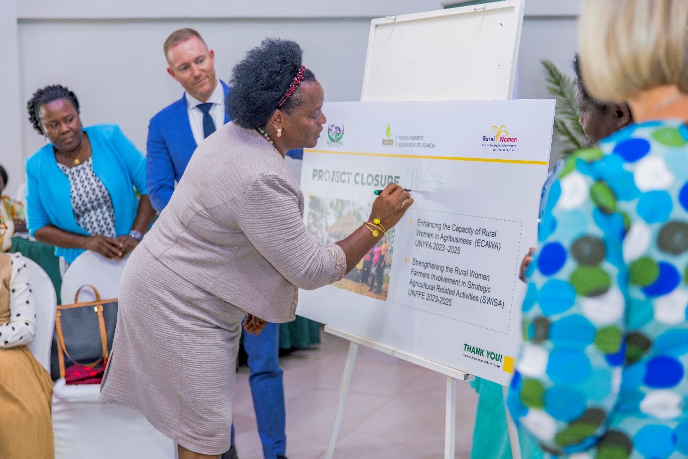 Hon. Mutuuzo signing a placard for the project closure of ECAWA and SWISA projects at the commemoration of the International…